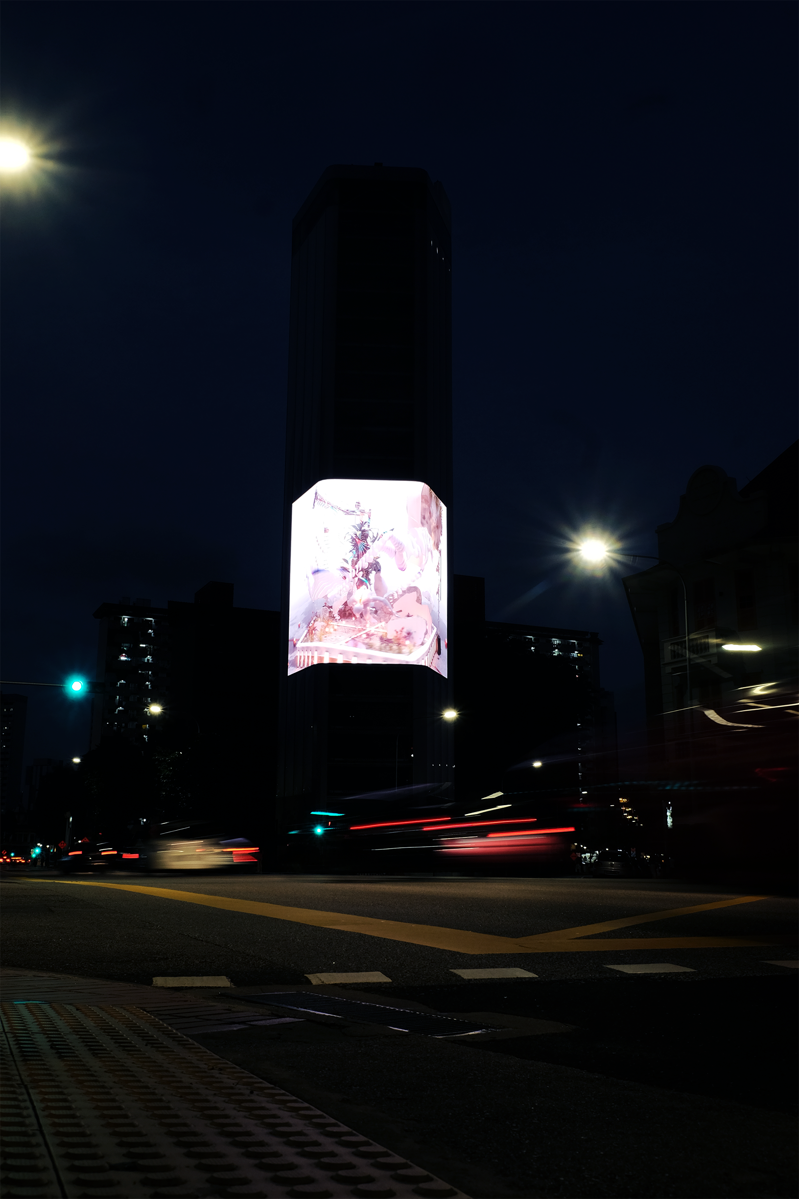 Installation view of Notochord 01 on TenSquare outdoor screens, Singapore, 2022, as part of Crossroads Festival 2022. Images by Sadiq Mansor & Studio Darius Ou.